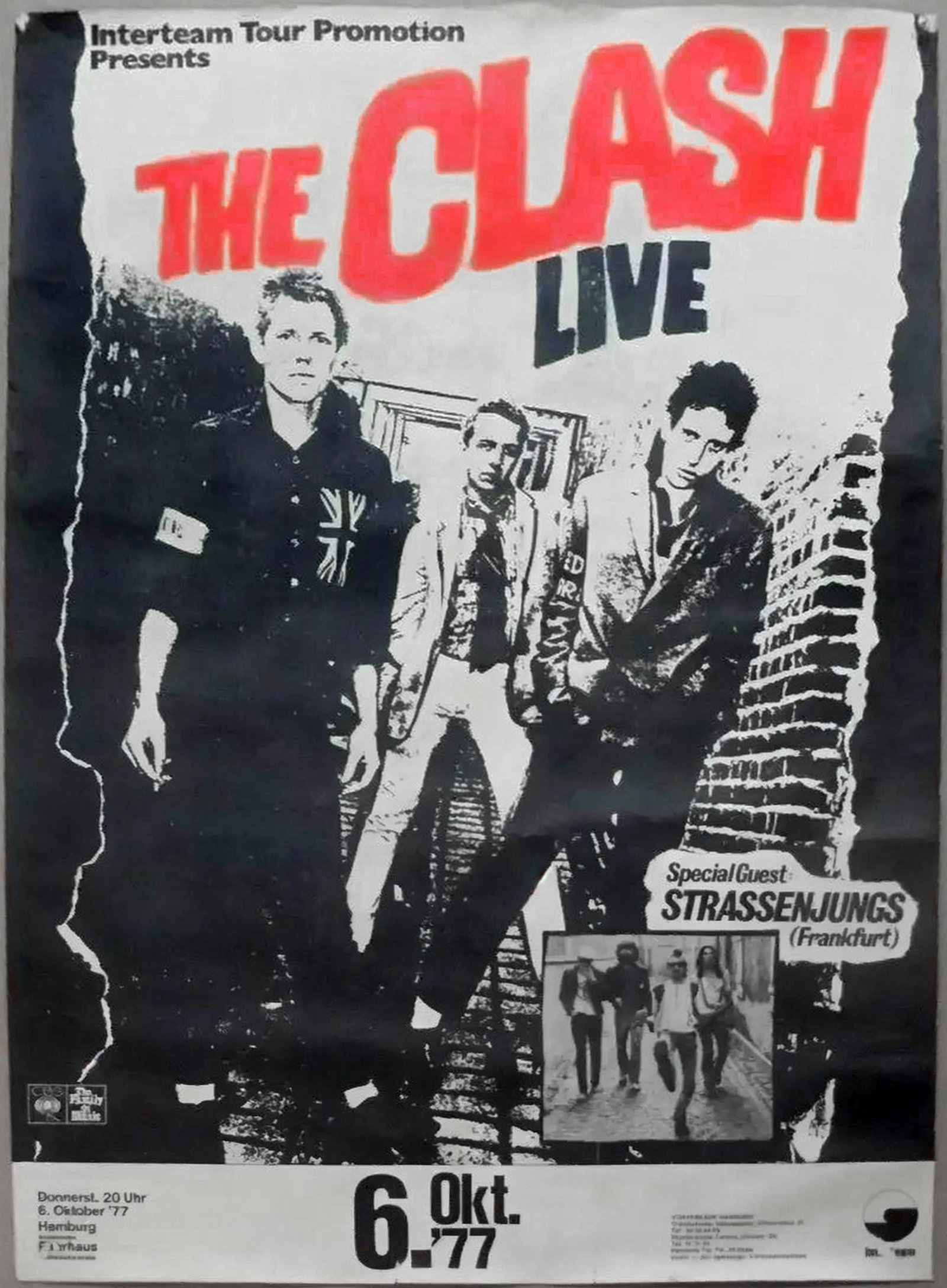 From October 4th–6th in fucking Germany - The Clash . Rumors 3 weeks beforehand, it was said they might come to Cologne , but nobody knew anything for sure. At the end of September, someone shoves a teeny-zine into my hand (no names) tour dates- Clash 4.10. Munich , 5.10. Frankfurt , 6.10. Hamburg . Shit. The greatest heroes of modern times are coming here—to where—the usual, see Ostrich No. 4 for comments. But in the week before, a totally stupid idea comes to me. How about,