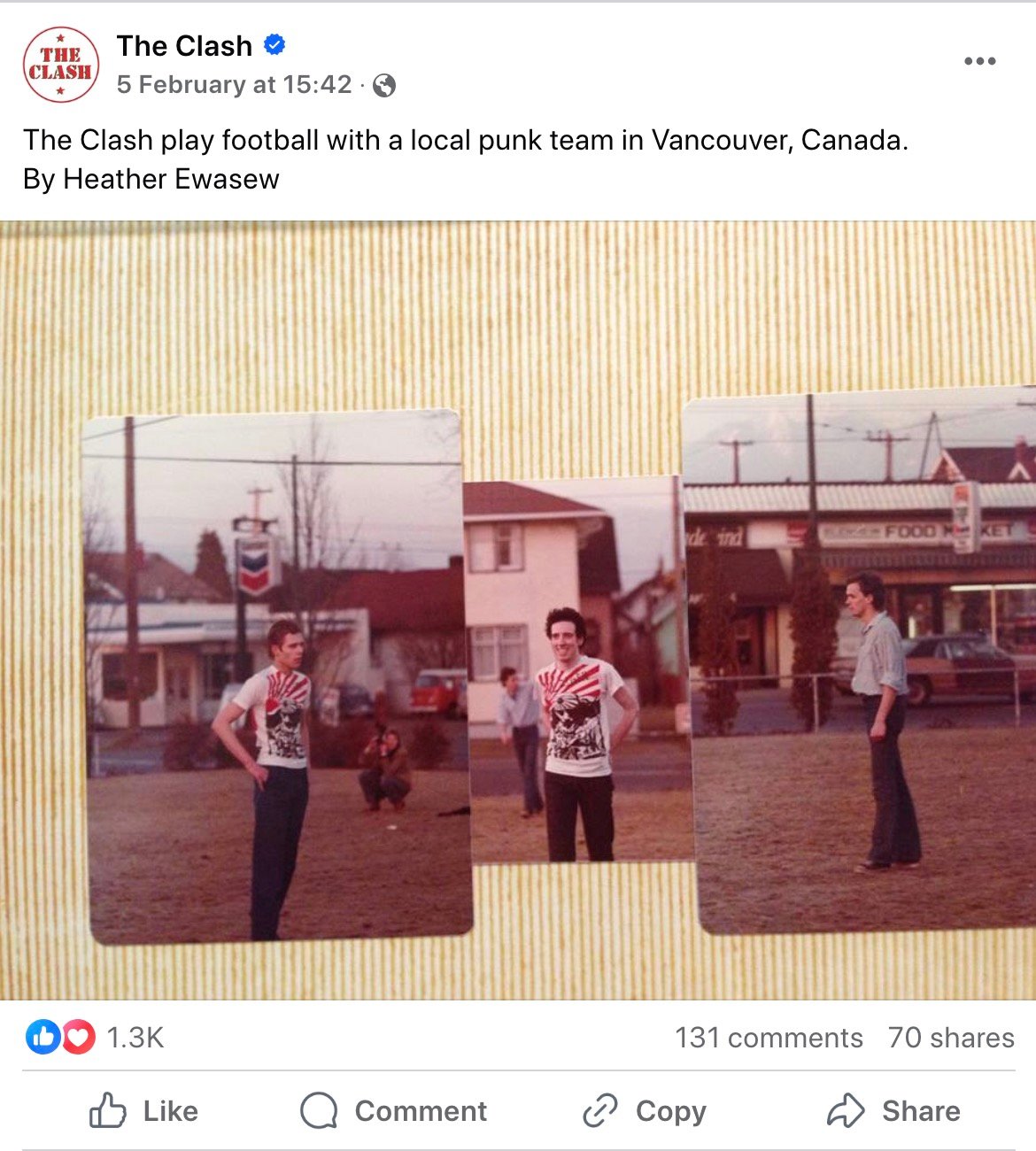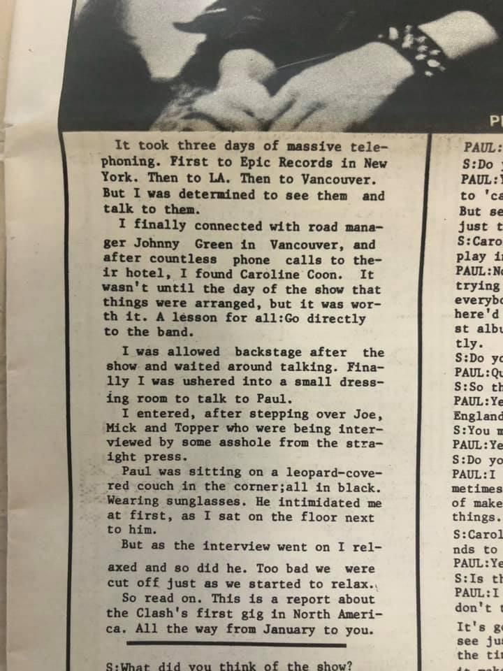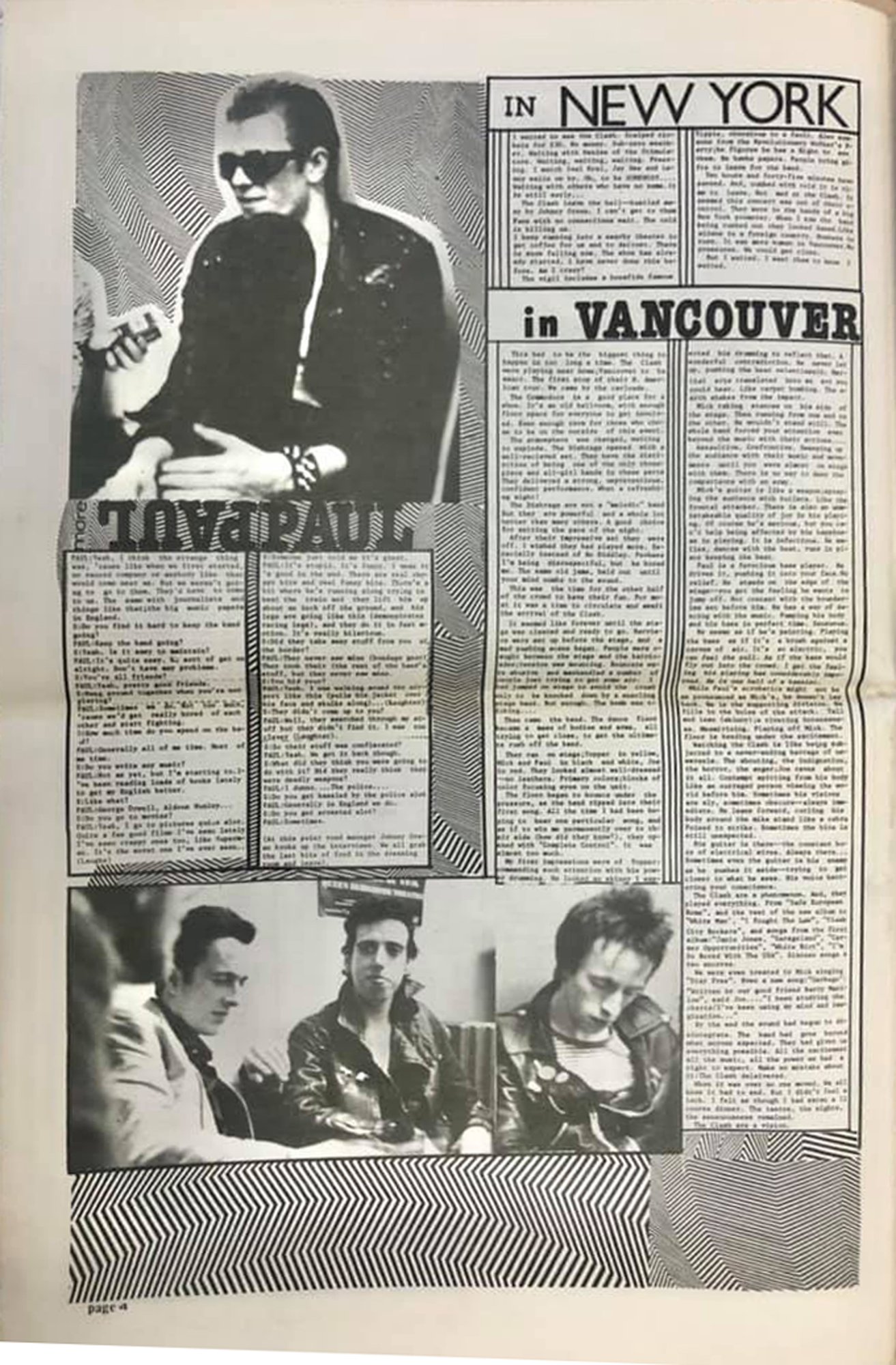 “The punks in Vancouver had the ripped jean jacket look, etc., and the Clash looked kind of bright. They had the brothel creeper shoes, they looked kind of in a different class. But at the same time they were really nice guys, they were very approachable.”