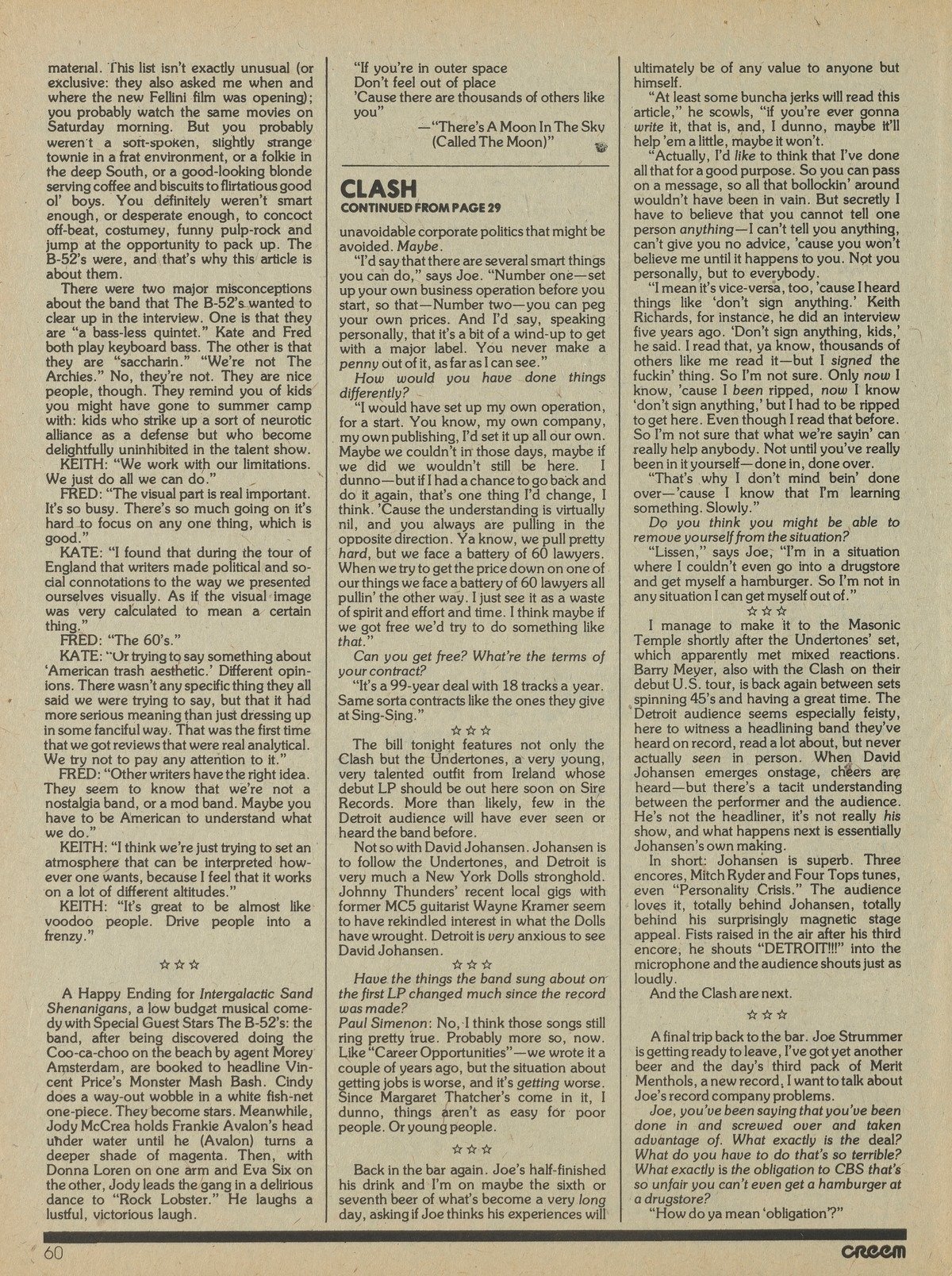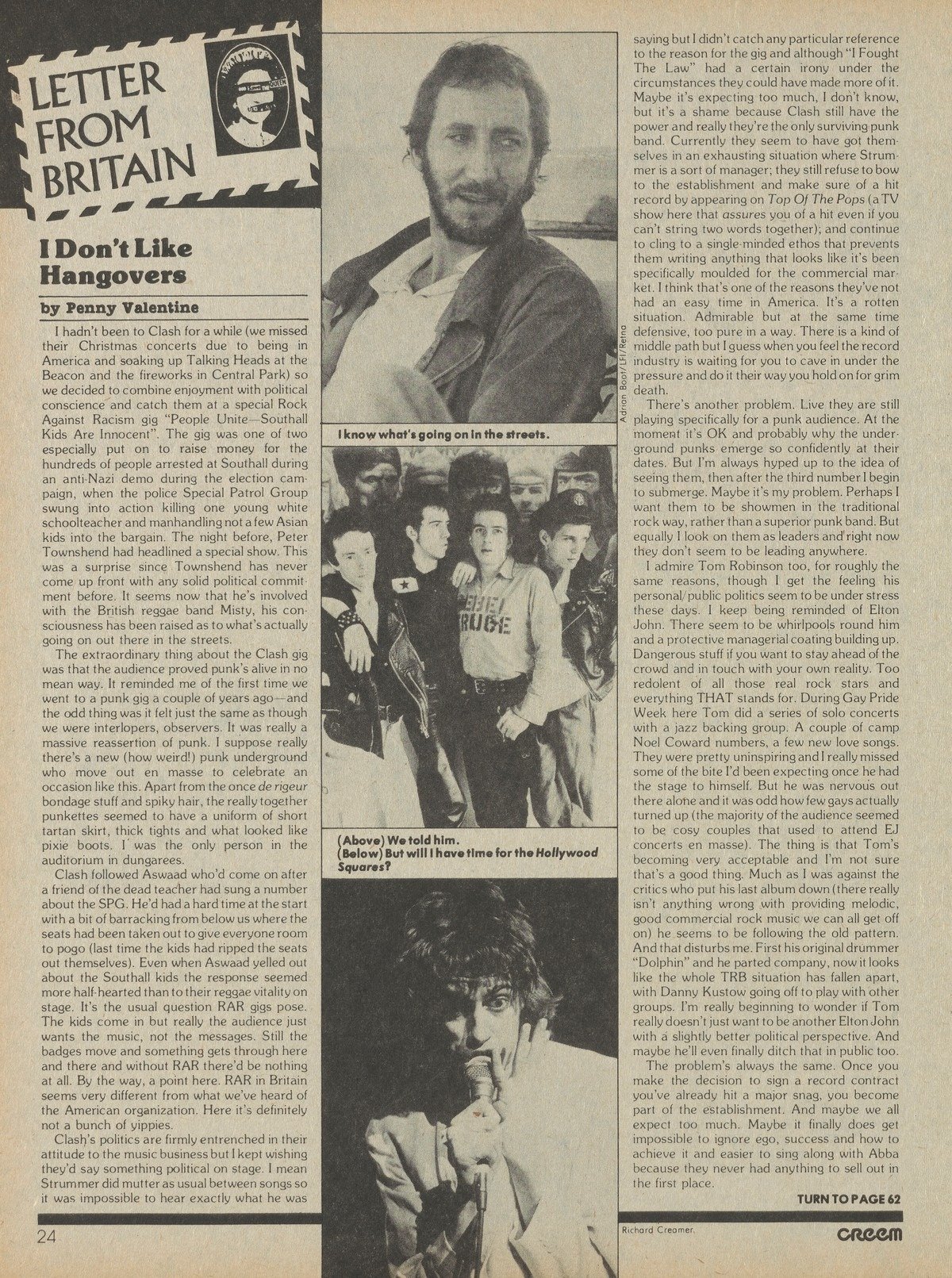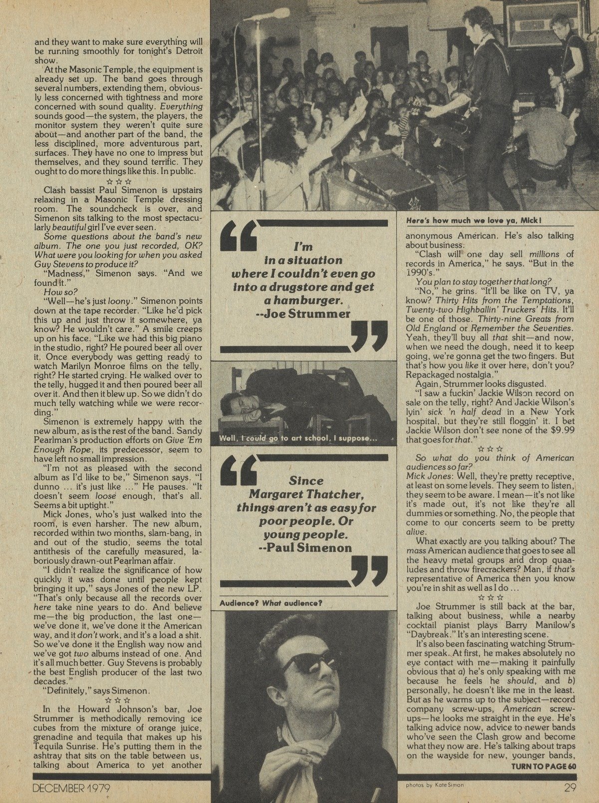Strummer: Last night I sat up reading back issues of Yipster Times. I read all about Carter and cocaine. Did you hear that they put the no-no on punk rock? It seems that those guys in the record companies have Jimmy's ear, and they ain't going to be promoting any of the punk-rock bands because they still have all of these old rock artists, they still want to sell thousands and millions of truckloads of rock stars on ego trips. Next year you won't be able to give away a Livin' in the USA album, which is the way that it's goin' in the USA. That's a bit limp, you know.