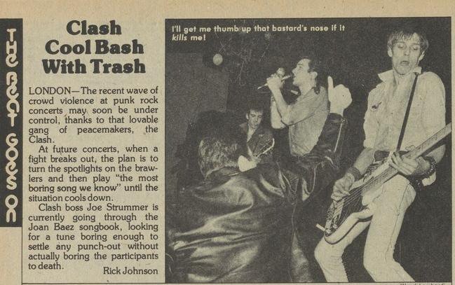 My last dispatch was suppressed by the authorities but chronicled Clash shows in Austin Texas on the 4th October. Clash quadruped Dallas on the 5th, President Killers with Houston the world! And Lubbock on the 7th as Hollymania sweeps Clash as all this was, I've only space here to write tour from Lubbock, the band flew, and the alcoholics bussed (via Route 66) to Los Angeles and the wildest show of the whole tour. The Hollywood Palladium audience looked different - as mean and nasty and posy looking as an English audience and were determined to go all over anything onstage that wasn't the Clash and to hurl a good bit on them as well. Joe Ely (a constant presence on this tour) and the (Rockabilly) Rebels played through non-stop abuse and spit and the Mi Ely band made them a dustbin of water which understandably made the front rows even more hostile to anything on the stage a lot of this was the ritual belligerence that audiences everywhere.