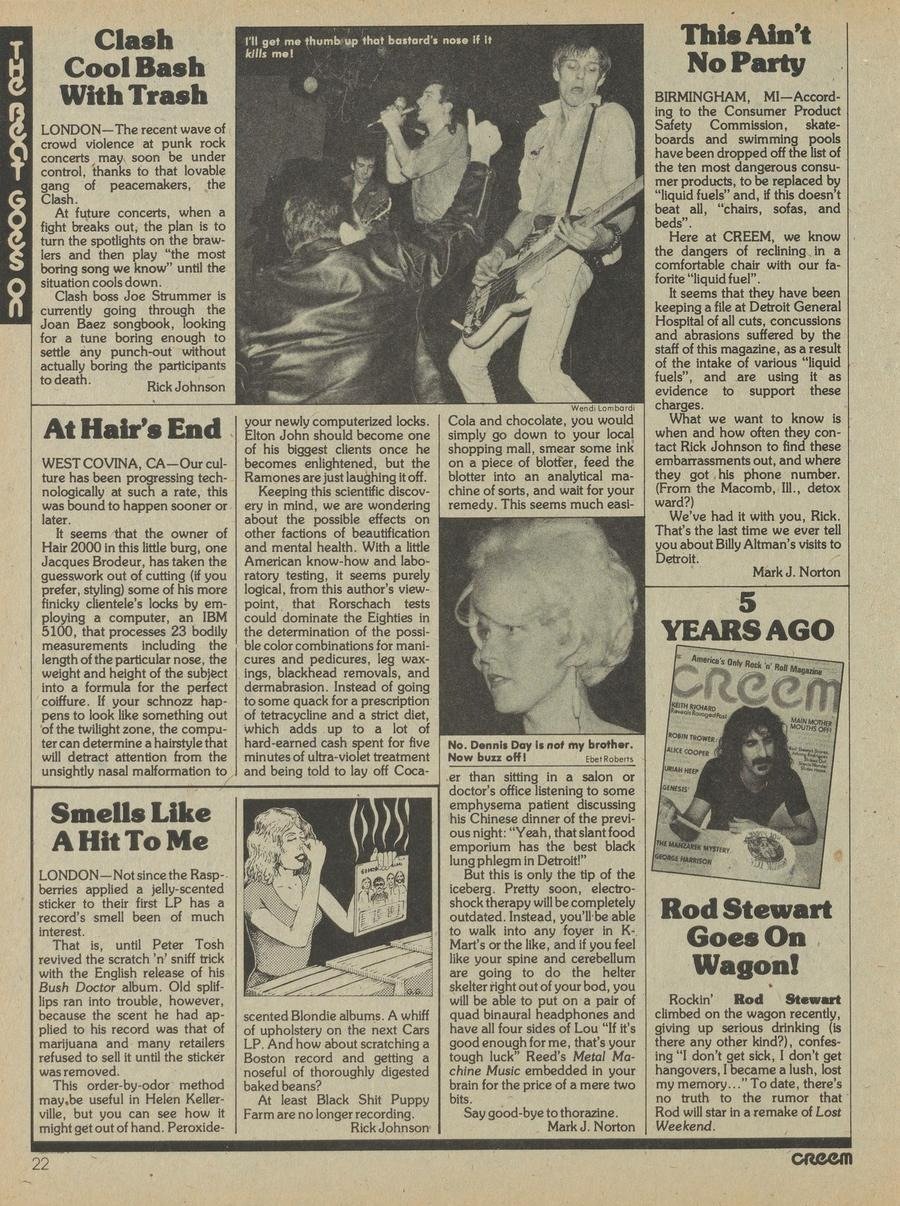 SINCE ATLANTA, Georgia, the band have played five shows in seven nights through Texas to Los Angeles taking in the Armadillo World Headquarters in Austin (one of the few American towns I've seen that I could imagine living in) Dallas and its schoolbook Depository, horrible Houston and Lubbock with Buddy Hollymania. Joe Ely has been supporting again, through Texas. It's supposed to be heresy to say so but he could be a great rocker if he got a tight band instead of the usual pedal-steel, accordion, kitchen sink and all mod cons arrangement that he has at present. After the Austin show on the 4th, he did a spot of jamming with a local band plus one M. Jones and one N. Headon for one number (Be-Bop-A-Lula) running through a bunch of straight old rockers like That's Alright, Whole Lotta Shakin' etc., in a local boozebar. Good stuff which I'd like to see him do with his own band. The Clash show in The Armadillo was a good one - the club has a nice atmosphere and I nicked a Coors beer jug. By Houston, on the fifth, I was walking in my sleep and I vaguely remember the show. Pennie Smith flew back to England with vast numbers of Clash photographs. It's a great pity that only a small percentage can be used by the weekly music press.