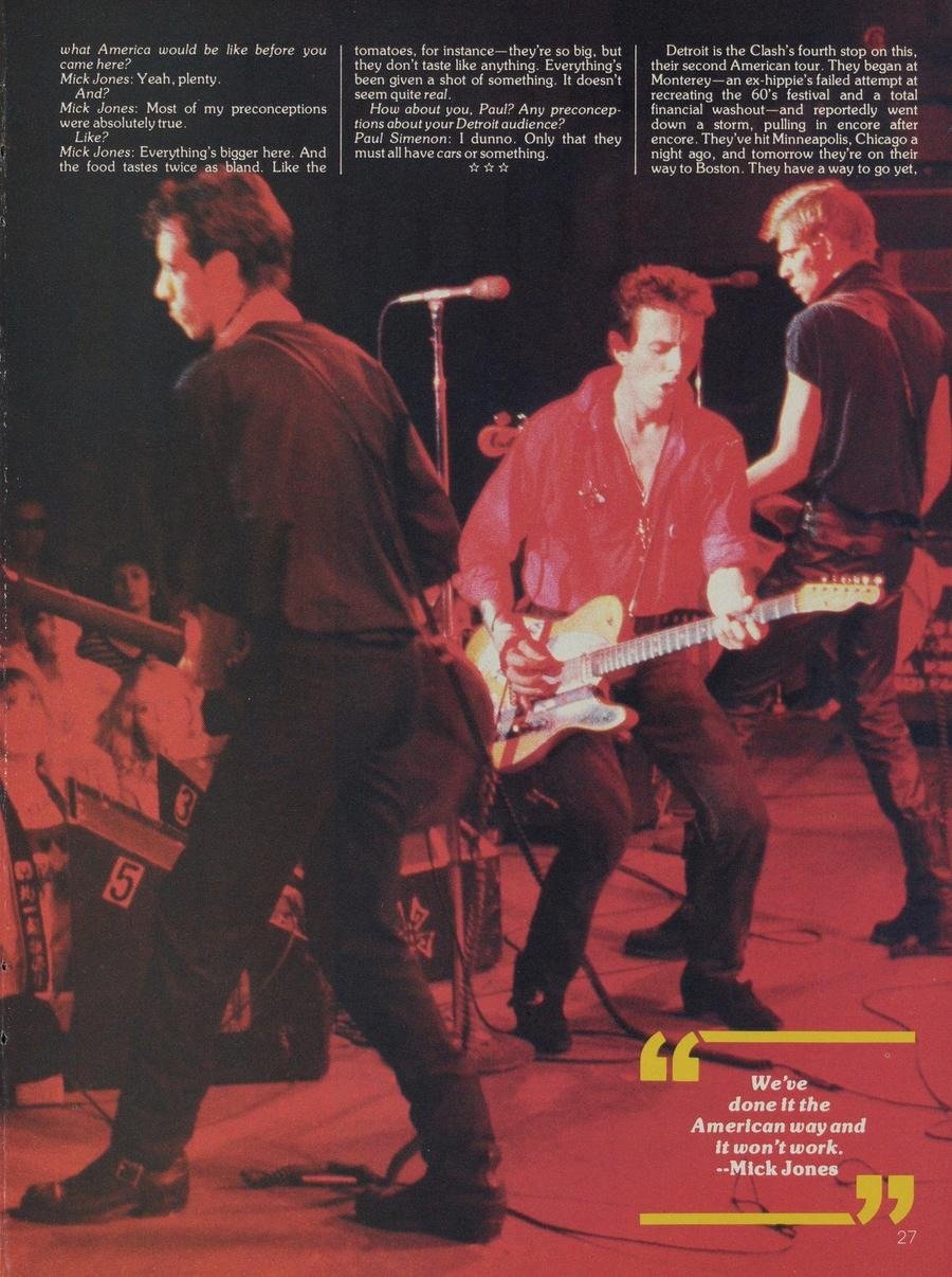 "What I saw in the band was a concentration of all the pain and outrage lodged in my gut." To many, of course, it's just a great rock and roll show. Guided by some infallible rock and roll tribal consciousness, The Clash are looking more than ever like the bastard offspring of Eddie Cochran out of Gene Vincent and a Harley Davidson.