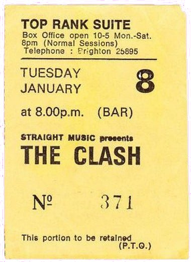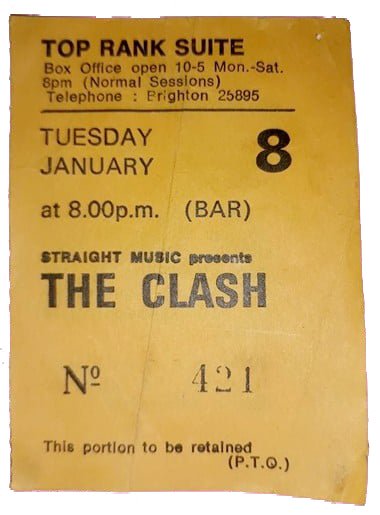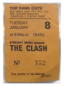 Robin Tate -- Tonight saw The Clash playing their 3rd gig of the 16 Tons Tour. Here's my original ticket [#339] I kept from the Brighton Top Rank, for this the 8th of January 1980. facebook
