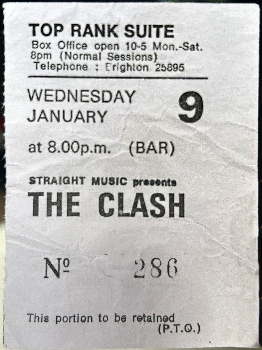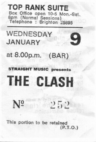 Robin Tate -- Tonight saw The Clash playing their 3rd gig of the 16 Tons Tour. Here's my original ticket [#339] I kept from the Brighton Top Rank, for this the 8th of January 1980. facebook