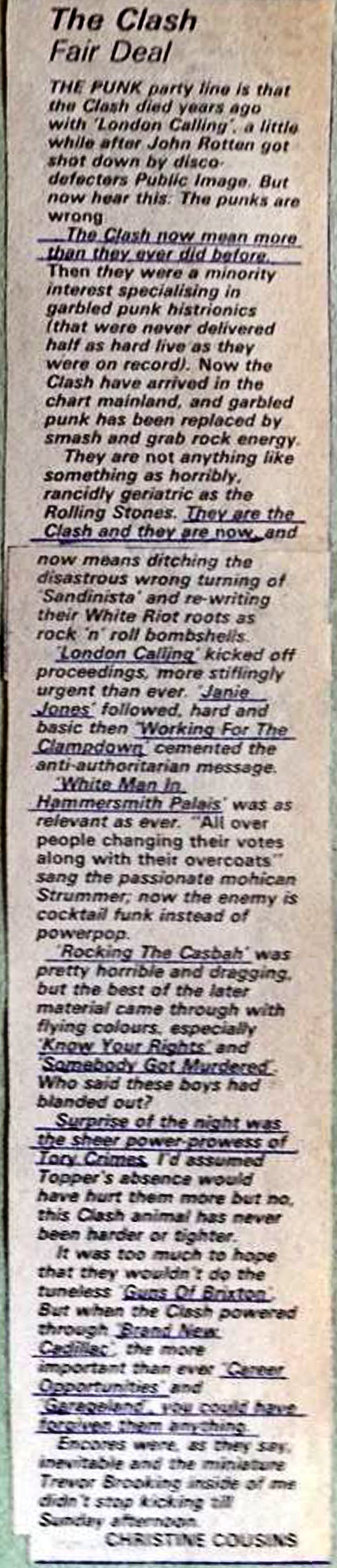 The tour was enough of an event for the national tabloid the Daily Mirror to cover the Brixton shows (10th or 11th is unclear). Simon Kinnersley's piece [link] is largely positive with some insight, "Many of their songs are performed in a maelstrom of jagged guitar chords, frenzied rhythms amidst shouting from vocalist Joe Strummer. Yet far from detracting from the show, the general mood of musical chaos seems to increase the excitement still further."